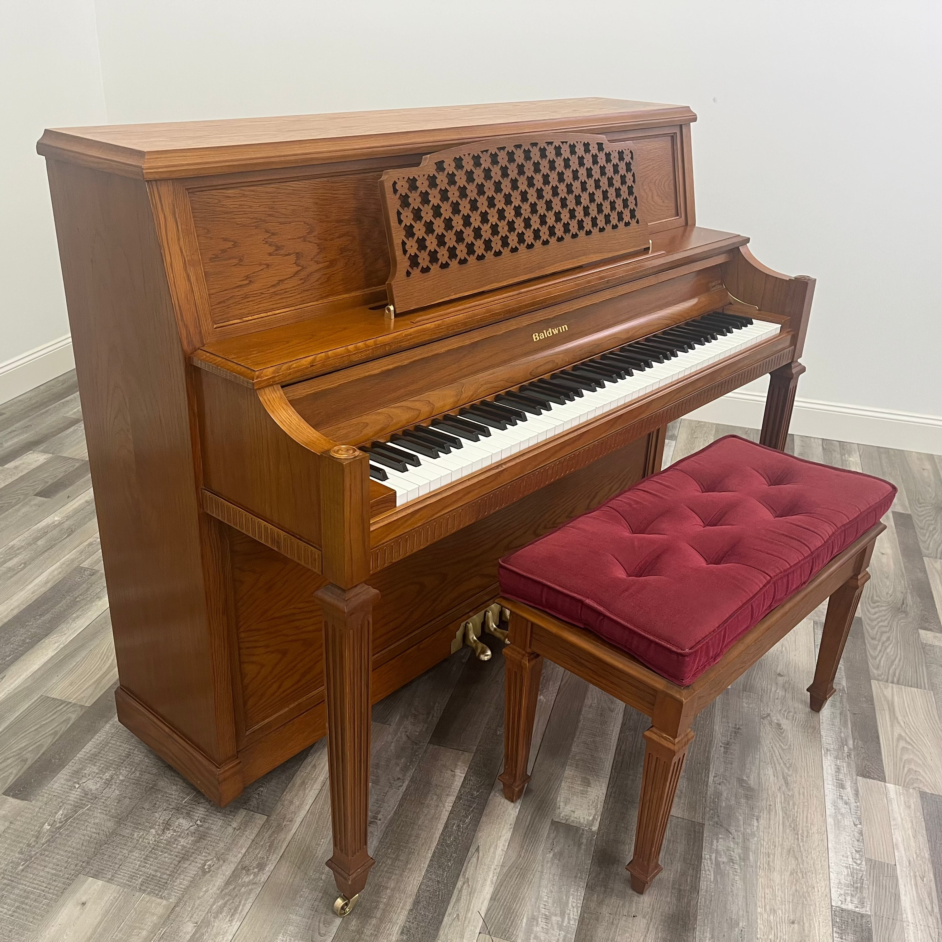 This is a Baldwin Hamilton Studio with a designer oak cabinet. Baldwin pianos are known for their 19-ply pinblocks, solid spruce soundboard, SyncrhoTone bass strings, and exclusive full-blown action. While built in the tradition of Baldwin grand pianos, this particular vertical piano showcases a uniquely articulate music stand design and includes a red cushion for the storage piano bench.